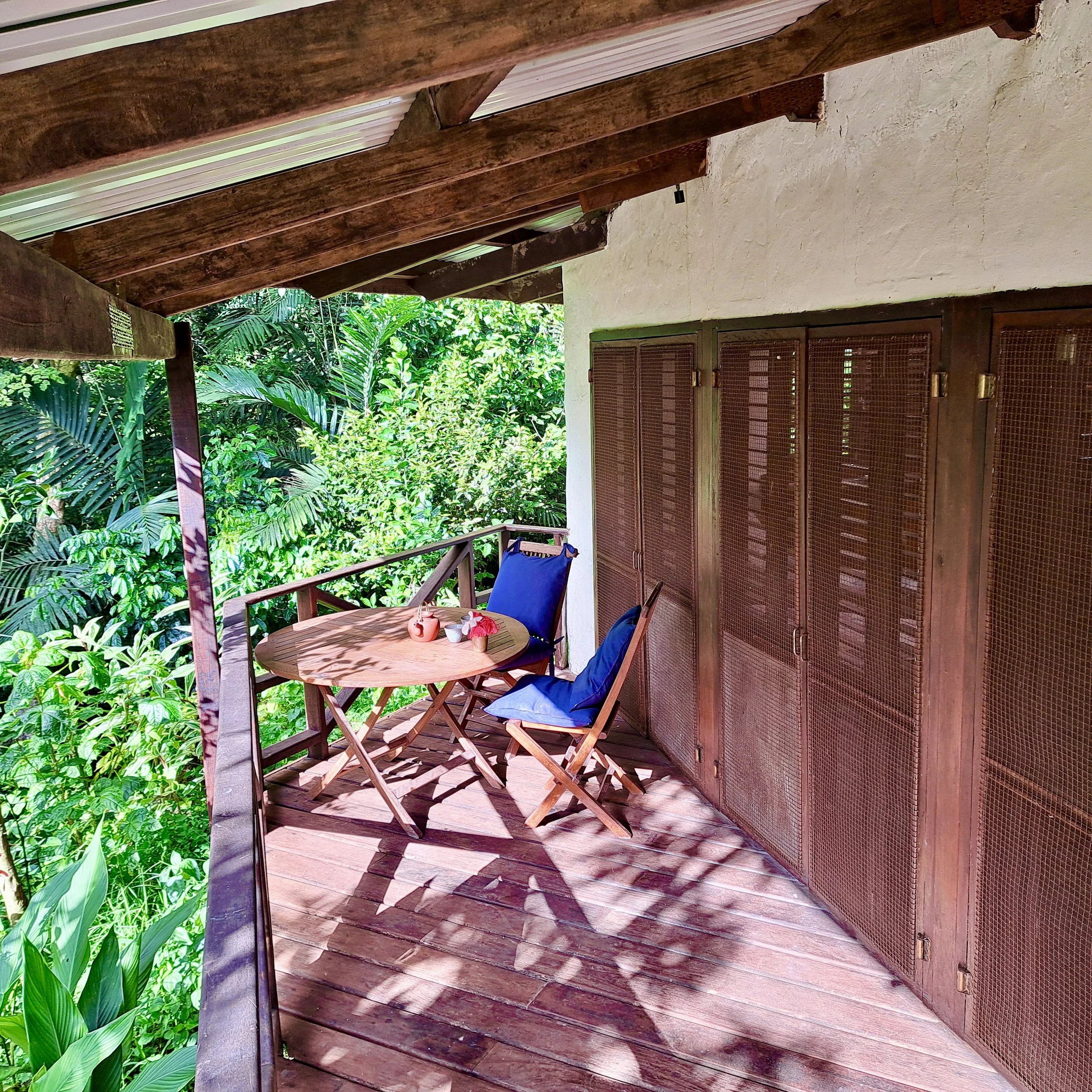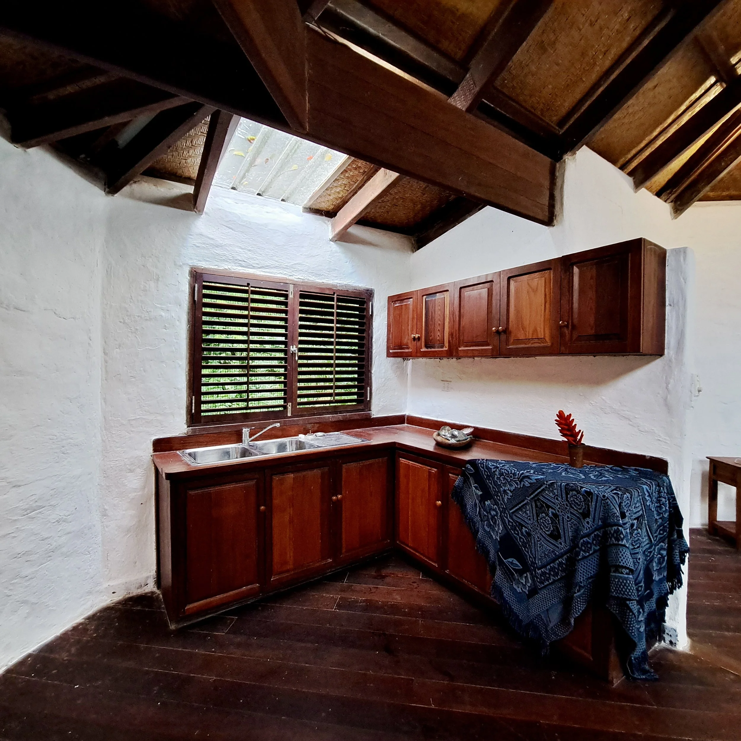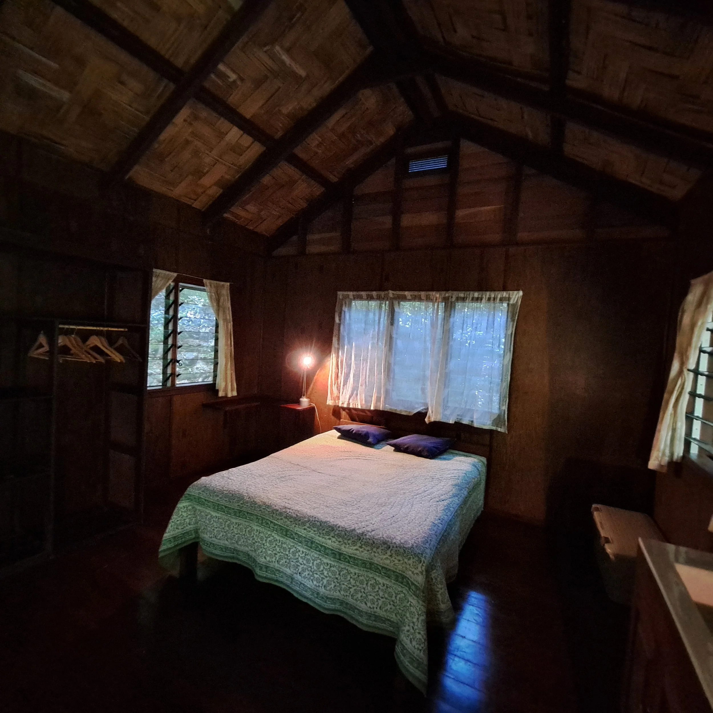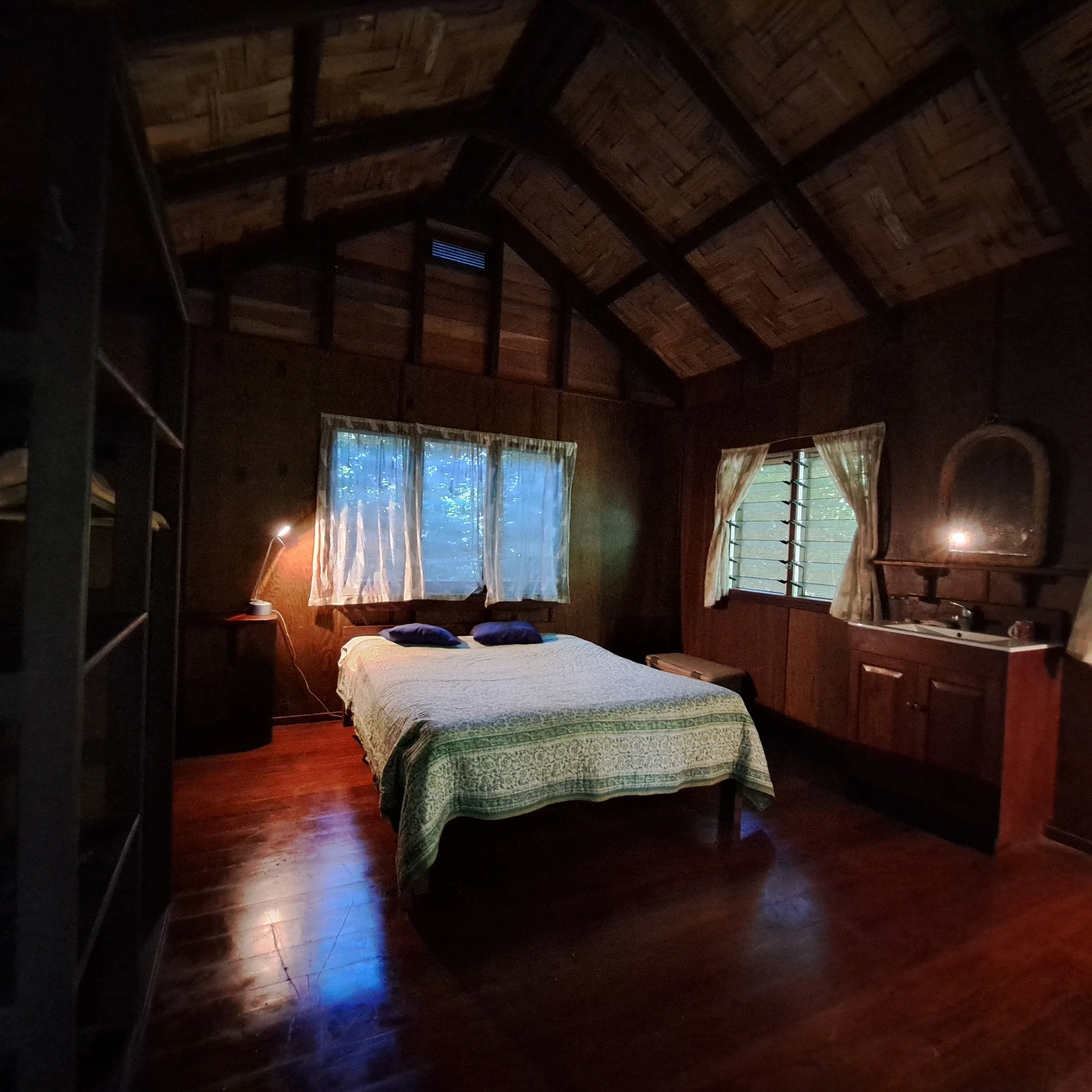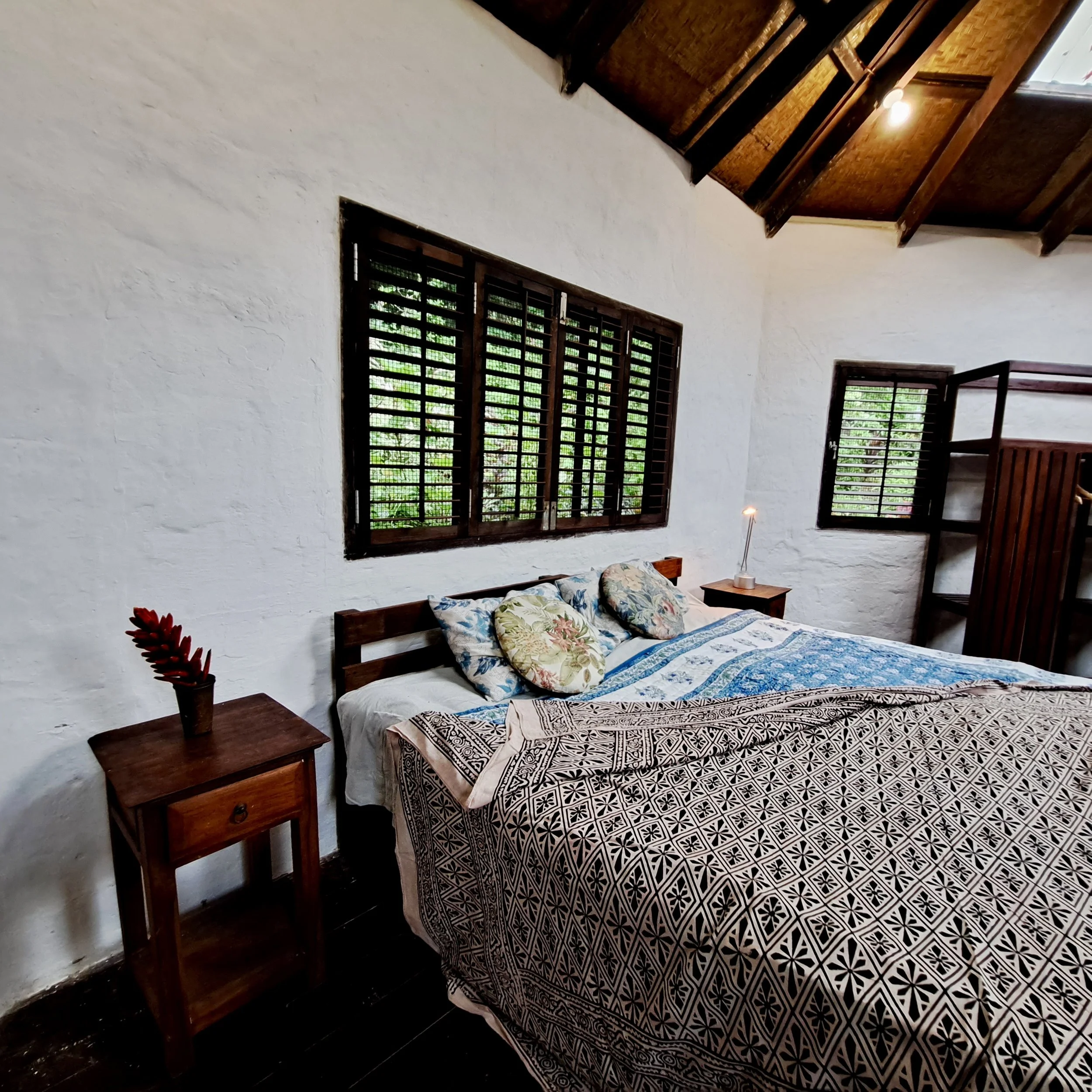 Both accommodations are convertible, so we can provide double beds as well as singles to family groups. Each bungalow is equipped with a kitchenette, comfortable furnishings, washing basin, overhead fan, a porch, electricity, WiFi access and running water.