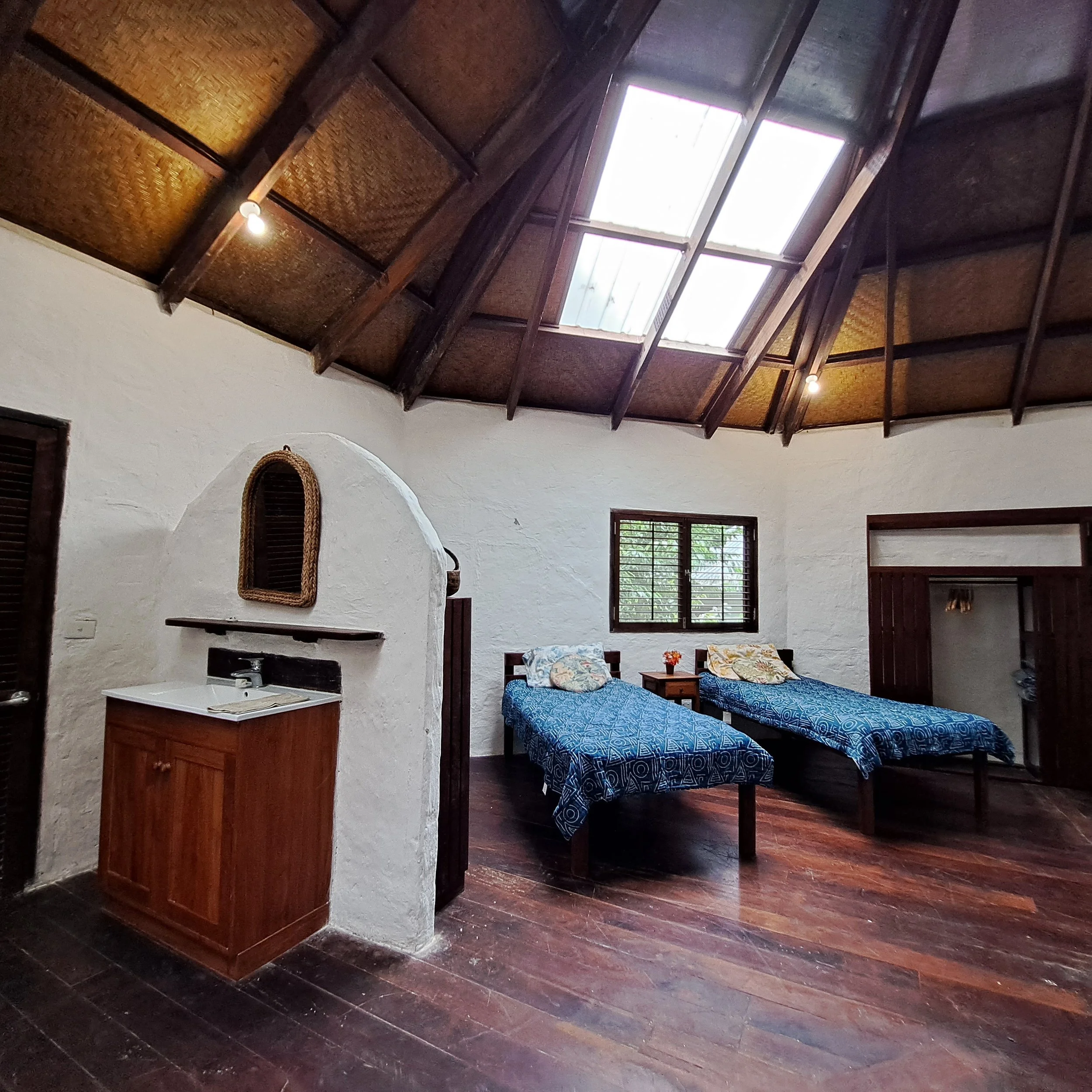 Houses are equipped with fresh springwater and solar-powered electricity. We have hot showers and a sauna on-site, as well as walking trails through the forest, access to a private waterfall, and abundant gardens full of tropical fruits.
