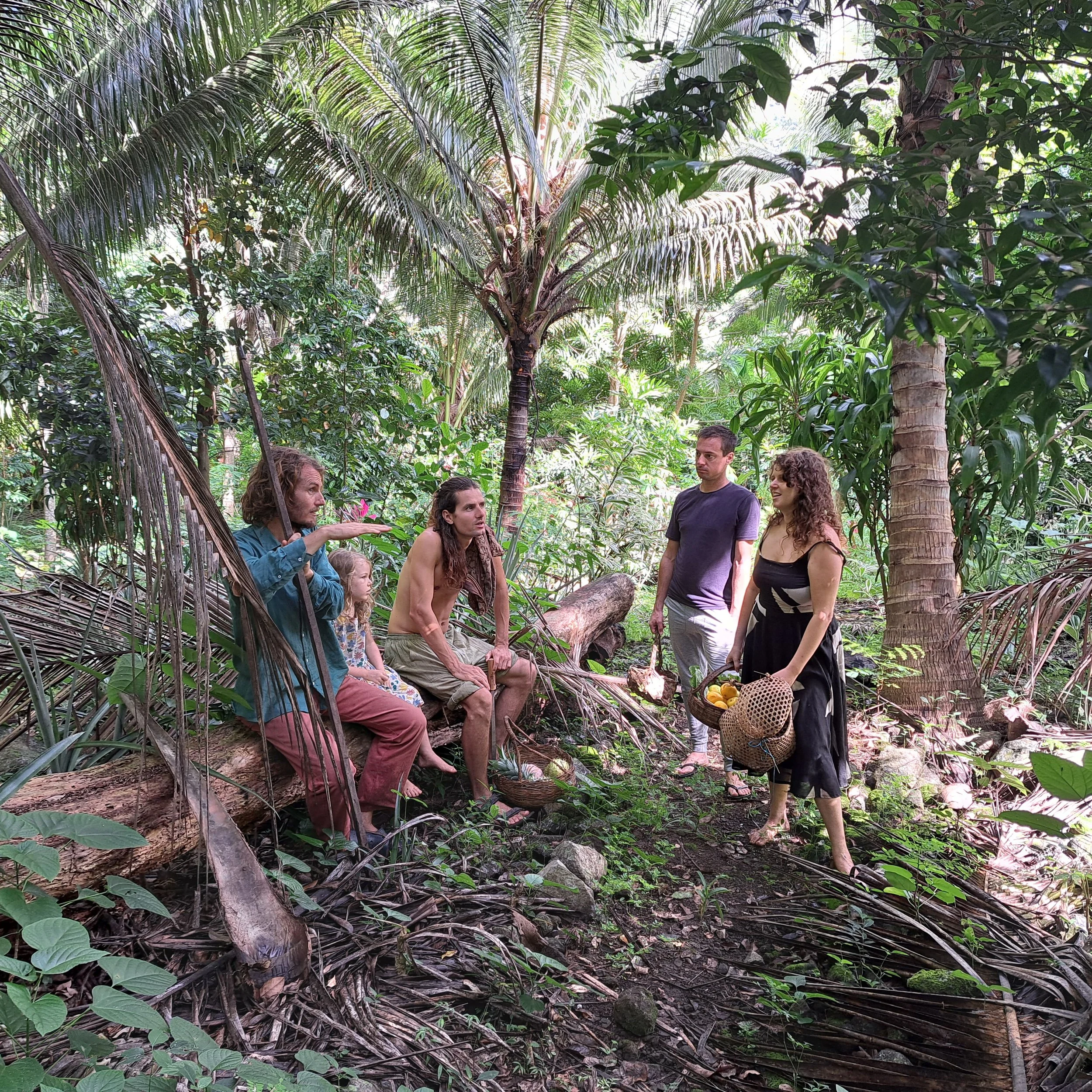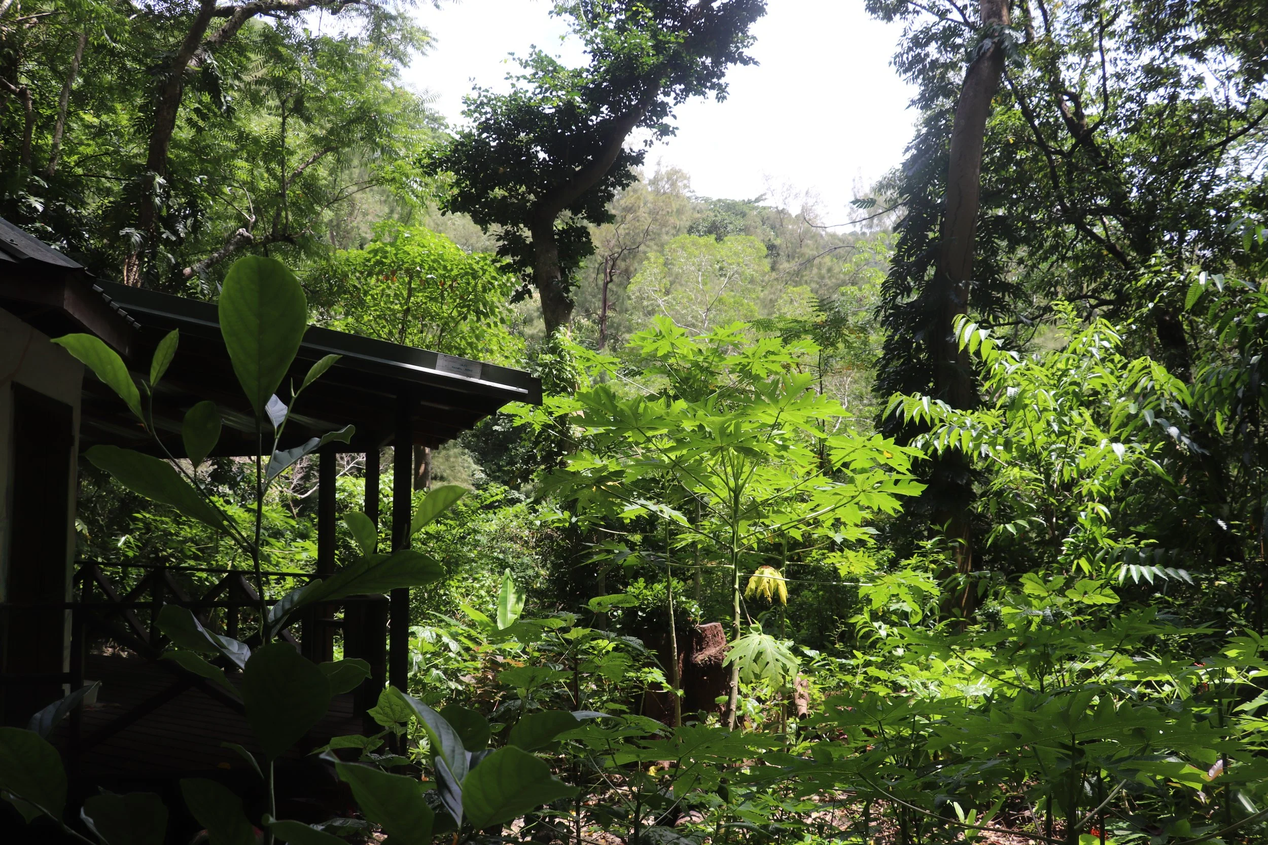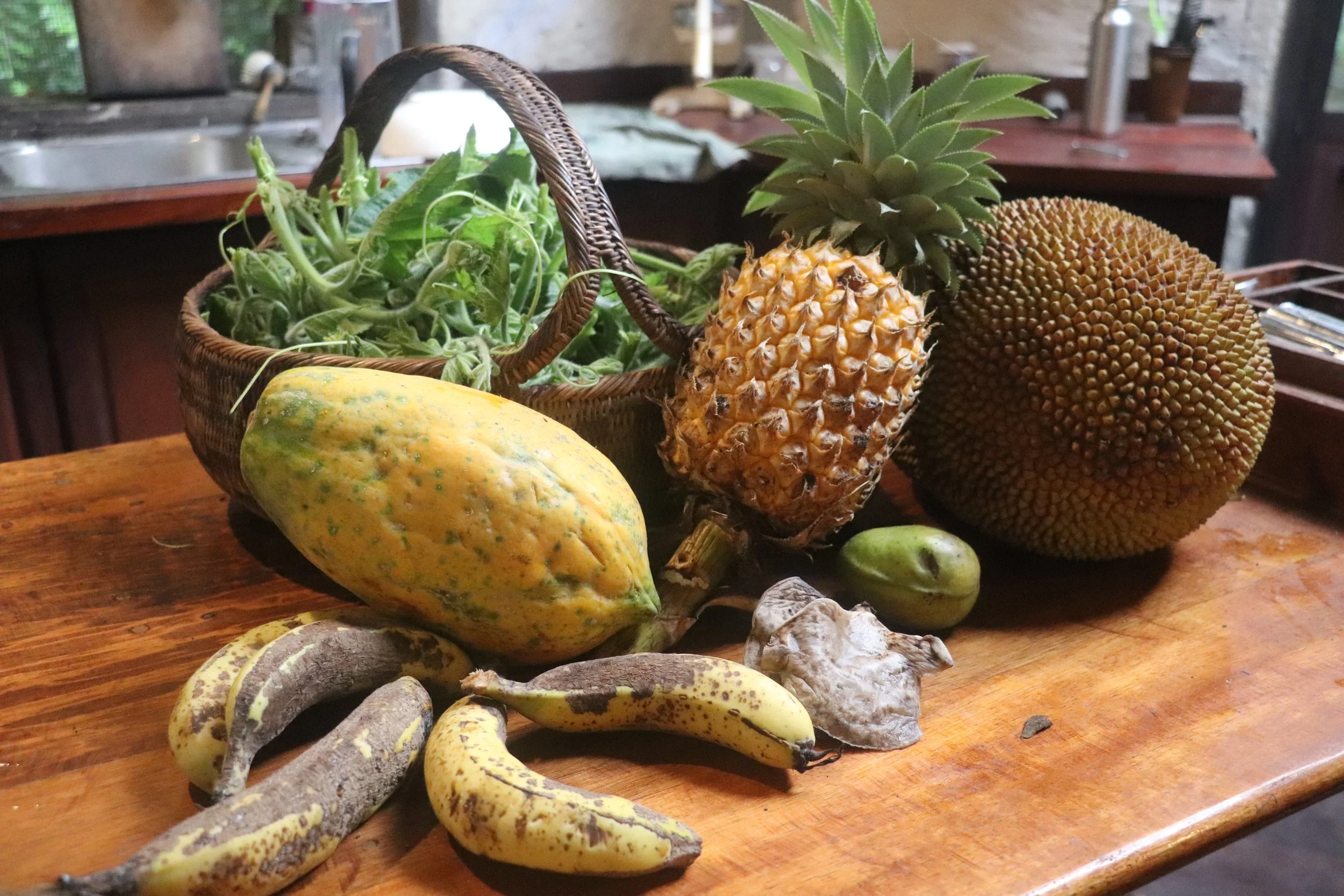 We eat an exclusively plant-based, wholefoods diet based on what grows here and in our local environs. Our approach to food is minimal, optimal and sustainable. We love what we have and we appreciate the abundance of what nature provides us daily. Staple foods are banana, papaya, jackfruit, taro, coconut, and greens. We also keep dry-goods such as beans and peanuts in storage.