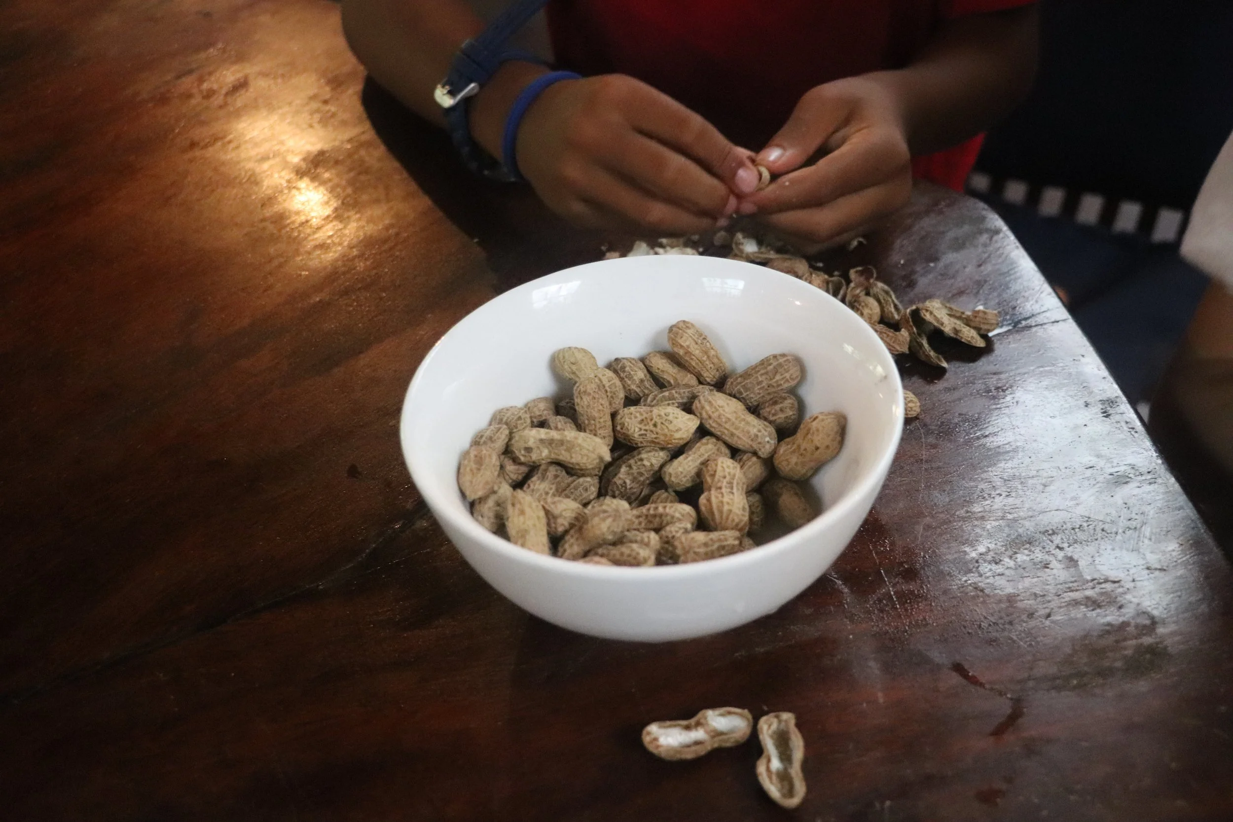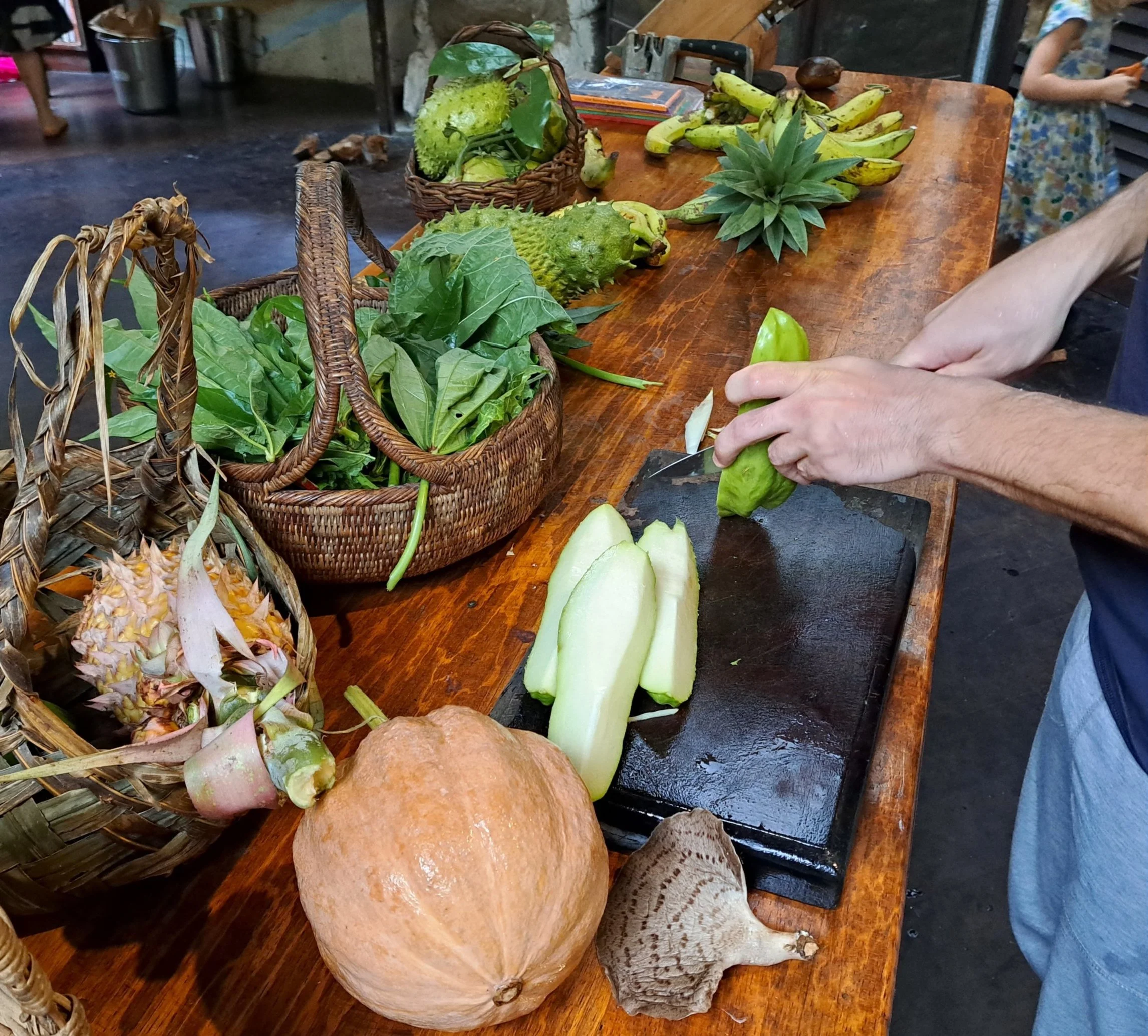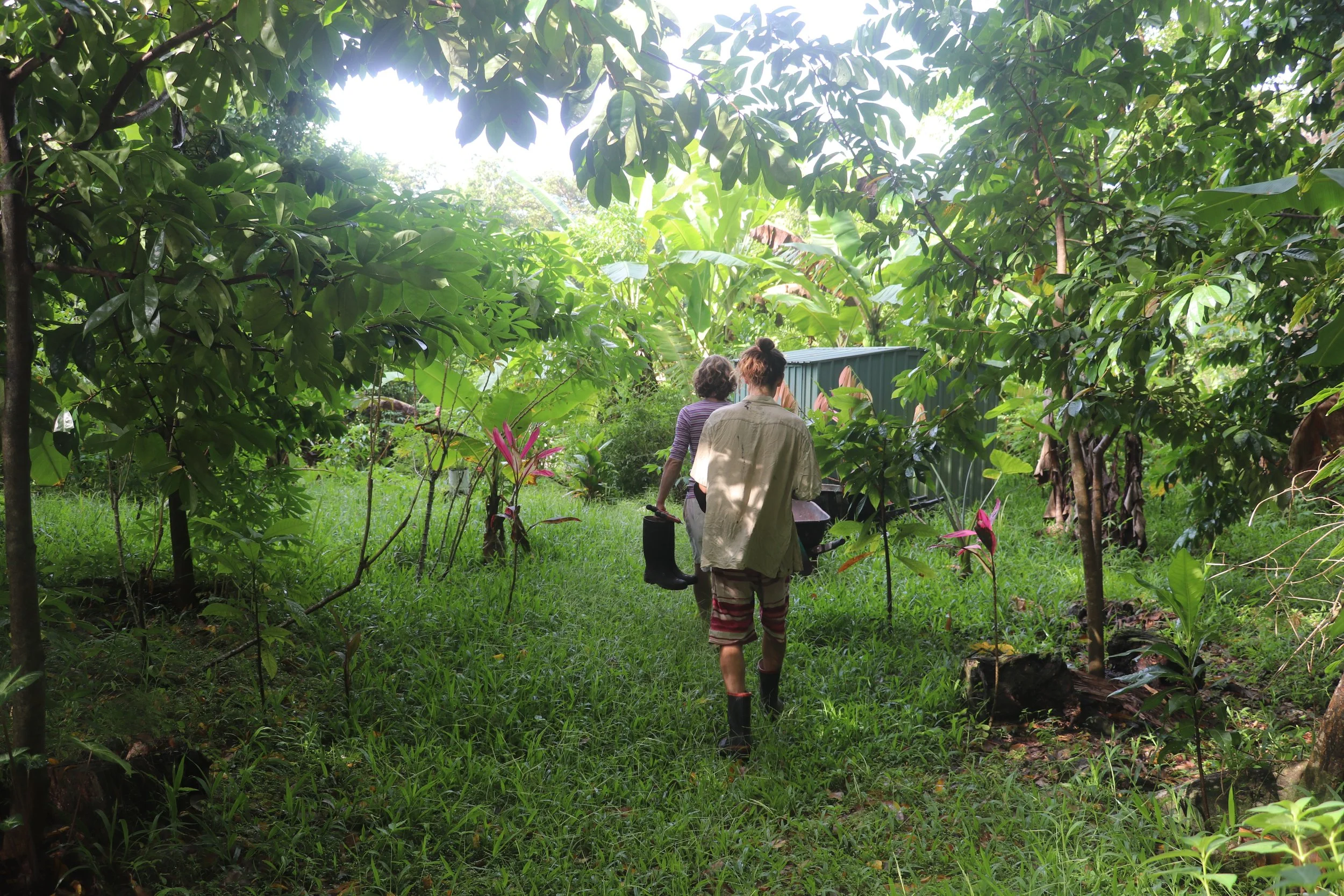 We eat an exclusively plant-based, wholefoods diet based on what grows here and in our local environs. Our approach to food is minimal, optimal and sustainable. We love what we have and we appreciate the abundance of what nature provides us daily. Staple foods are banana, papaya, jackfruit, taro, coconut, and greens. We also keep dry-goods such as beans and peanuts in storage.